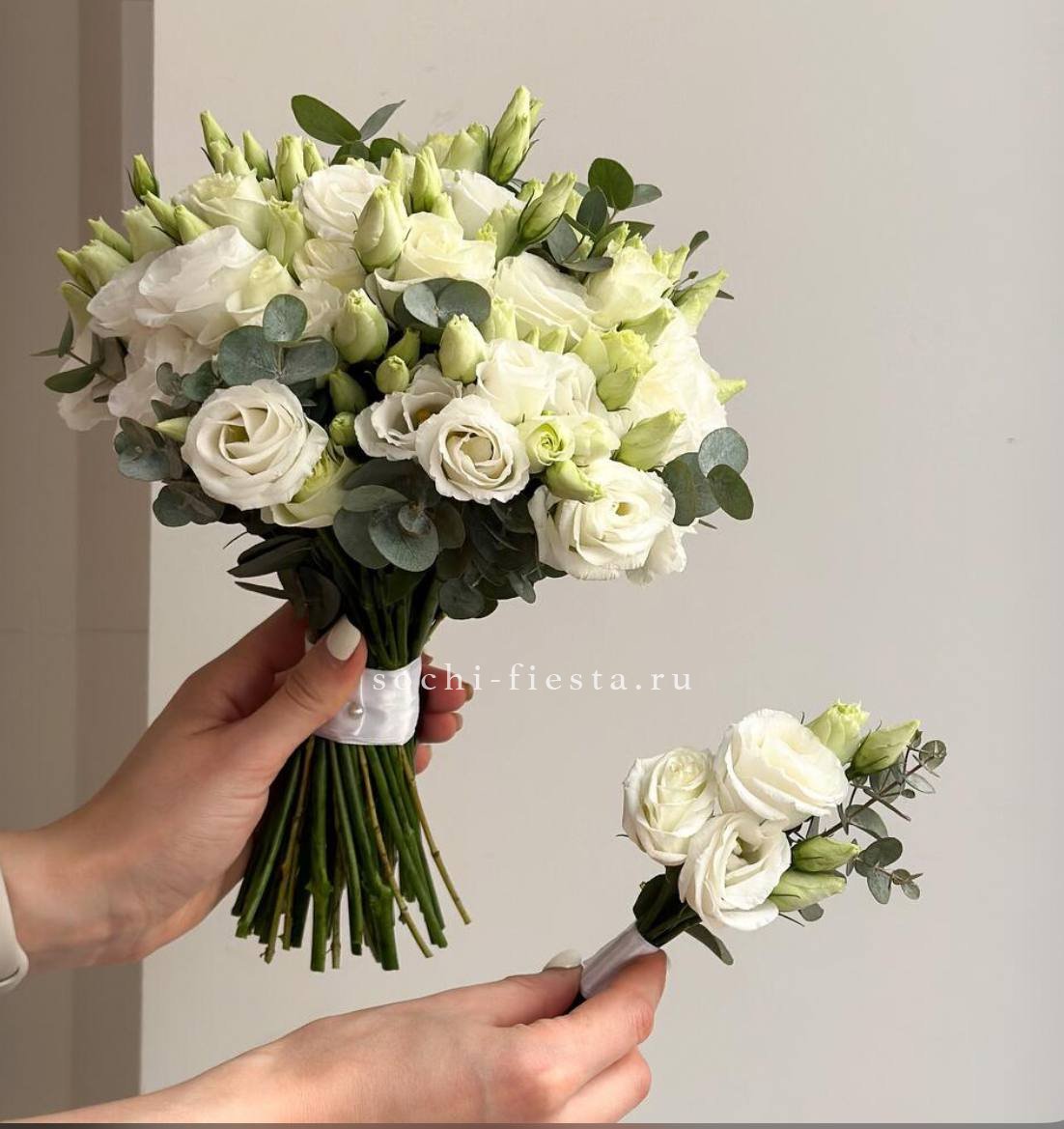 кустовые пионовидные розы Бомбастик, одноголовая пионовидная роза (или замена вне сезона на кустовую пионовидную), диантусы, эвкалипт, лента.