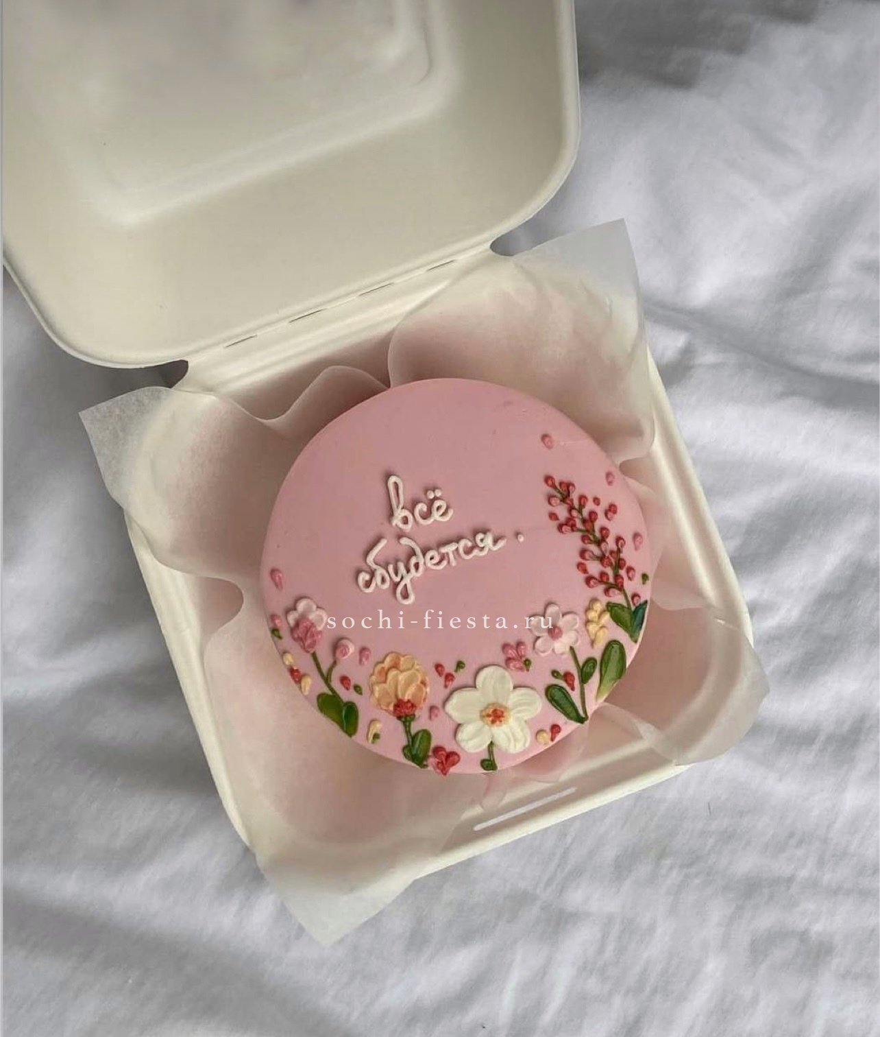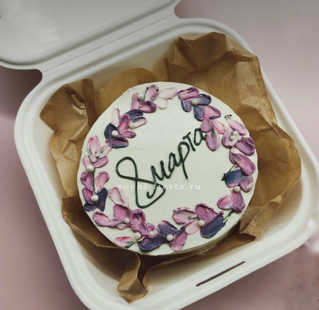 Дизайнерский бенто-торт ручной работы с поздравительной надписью и готовым декором. Формат удобен для камерного чаепития или как дополнение к основному подарку.